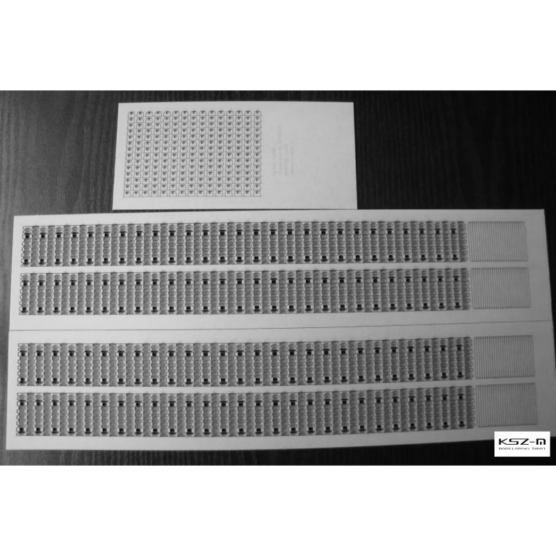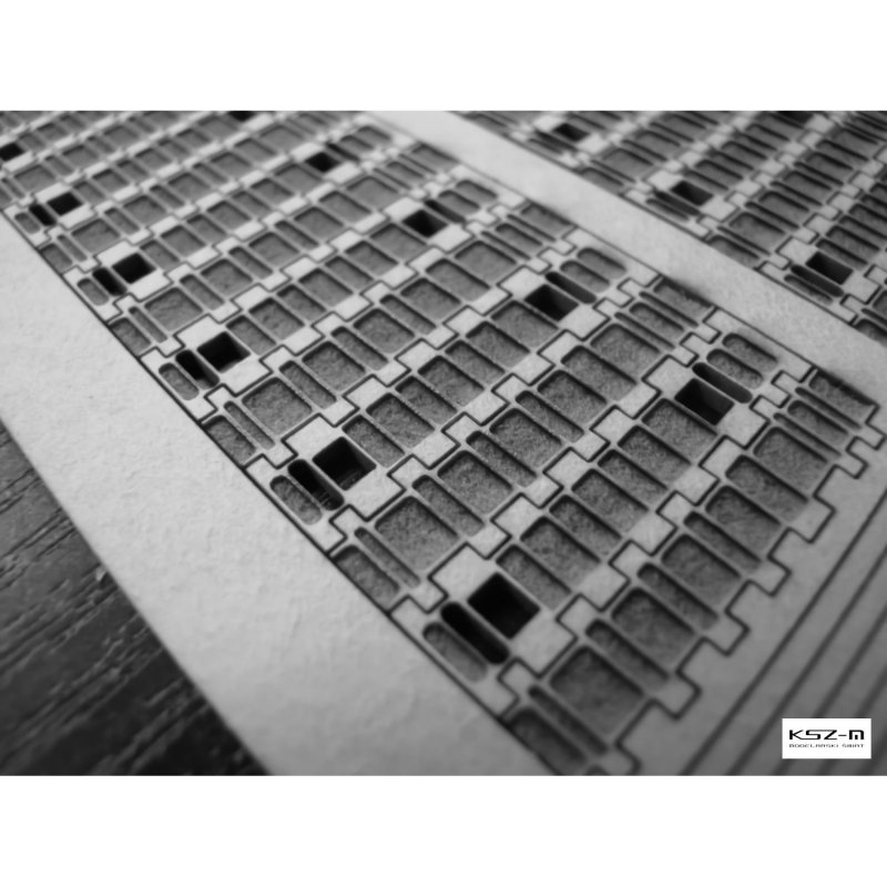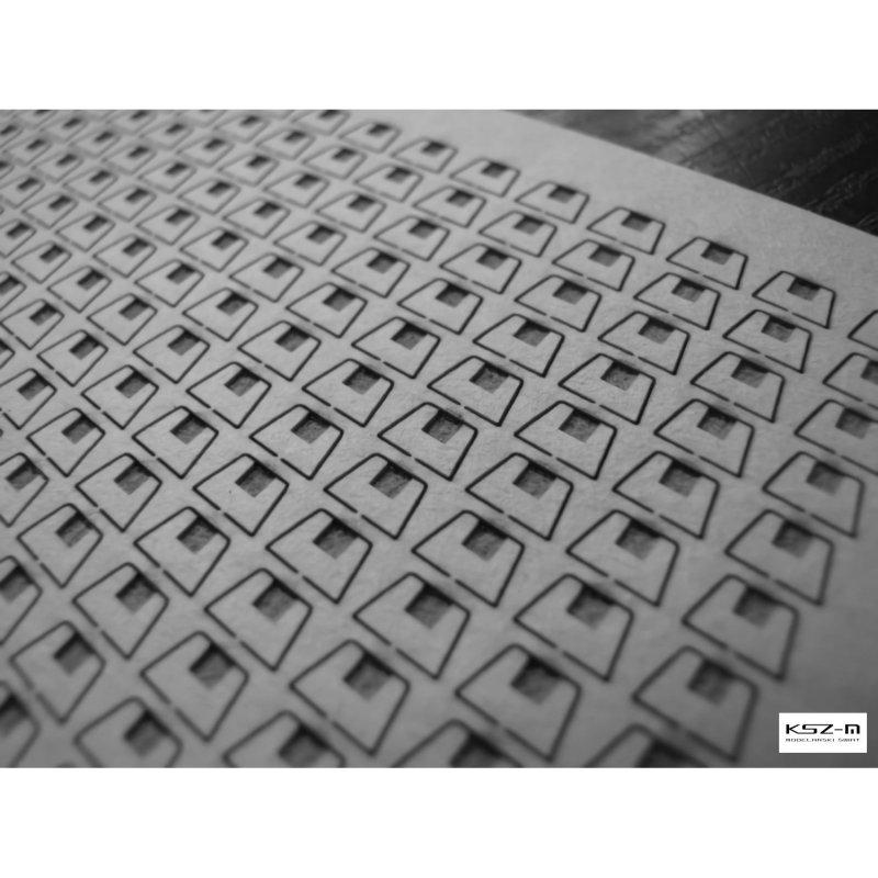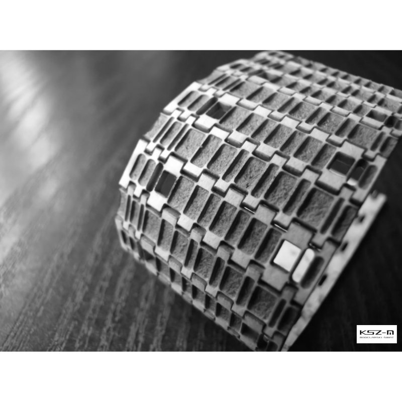 W zestawie znajdują się gotowe, laserowo grawerowane i wycięte paski gąsienic. To kompletna gąsienica z jednej warstwy tektury o właściwej grubości. Dzięki odpowiednio zaplanowanej i praktycznie przetestowanej cięto-grawerowanej konstrukcji styku ogniw „zawinięcie” na kołach napinających czy napędowych nie jest krzywizną, tylko realistycznie się załamuje - same ogniwa pozostają płaskie tworząc pomiędzy sobą szczeliny (zobacz przykładowe zdjęcie). Doskonały efekt przy niewielkim nakładzie pracy.