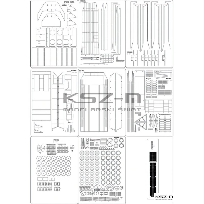 Zestaw elementów wycinanych laserowo przeznaczony do modelu kartonowego Transporter PTG K-61 w skali 1:25. Dodatek obejmuje szkielet konstrukcyjny, detale oraz bieżniki, które znacząco podnoszą precyzję wykonania i ułatwiają montaż modelu.