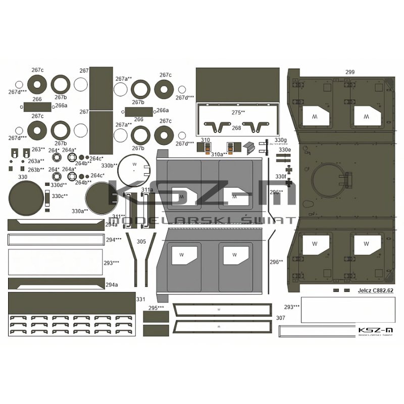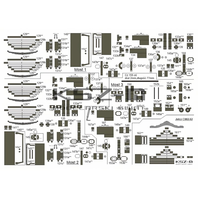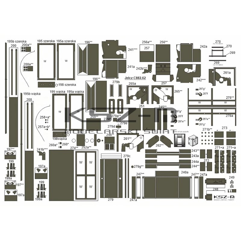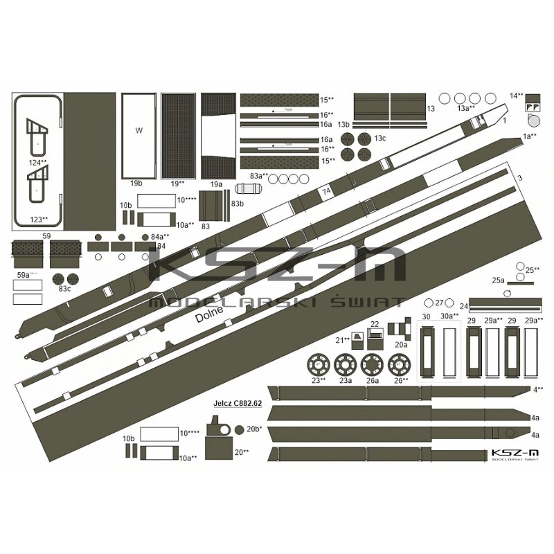 - Zestaw zawiera: arkusze z pomalowanymi częściami modelu, instrukcję montażu, rysunki montażowe