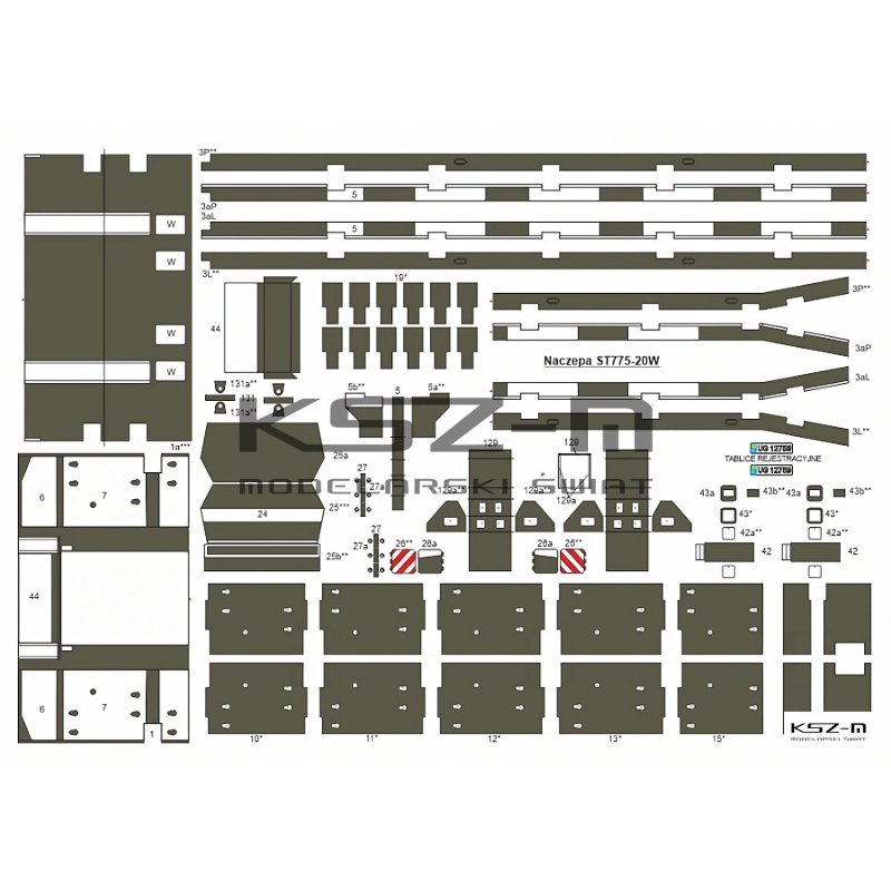 - Detale: wieloosiowe podwozie ciągnika, szczegółowa rama nośna, pełne odwzorowanie układów jezdnych, wyposażenie kabiny, konstrukcja naczepy ST775-20W