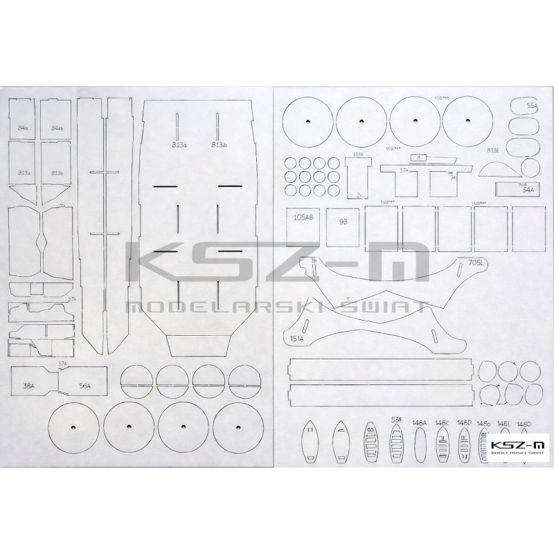 Elementy zostały wykonane z tektury modelarskiej przy użyciu technologii precyzyjnego cięcia laserowego, co zapewnia wysoką powtarzalność kształtów oraz idealne dopasowanie do części drukowanych. Szczególnie istotne jest to w przypadku szkieletu kadłuba oraz bieżników, gdzie ręczne wycinanie byłoby czasochłonne i obarczone ryzykiem niedokładności. Zestaw ułatwia zachowanie właściwej osiowości, symetrii oraz sztywności konstrukcji.