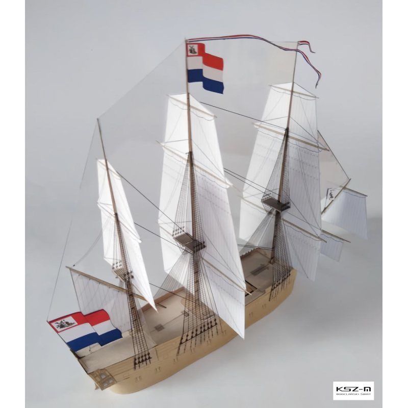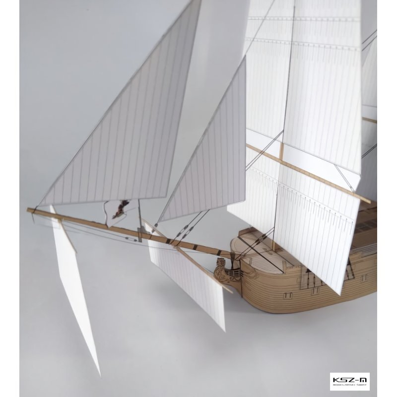 Uproszczony model żaglowca. Maszty i takielunek zostały wydrukowane na przezroczystej folii, dzięki czemu nie ma potrzeby wykonywania olinowania własnoręcznie.